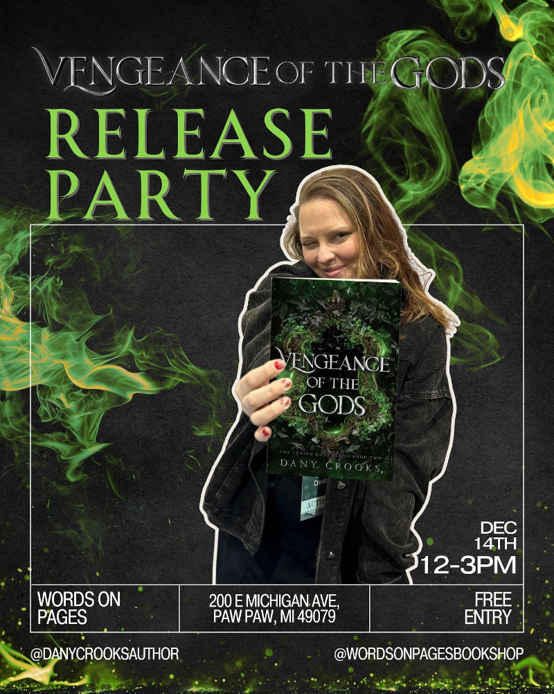 Join us at Words on Pages Sunday, December 14, from 12pm-3pm as we welcome author Dany Crooks and celebrate the release of her new book, Vengeance of the Gods!We’ll have raffles, free goodies, a brief Q&A, snacks, and plenty of copies of Vengeance of the Gods available!
